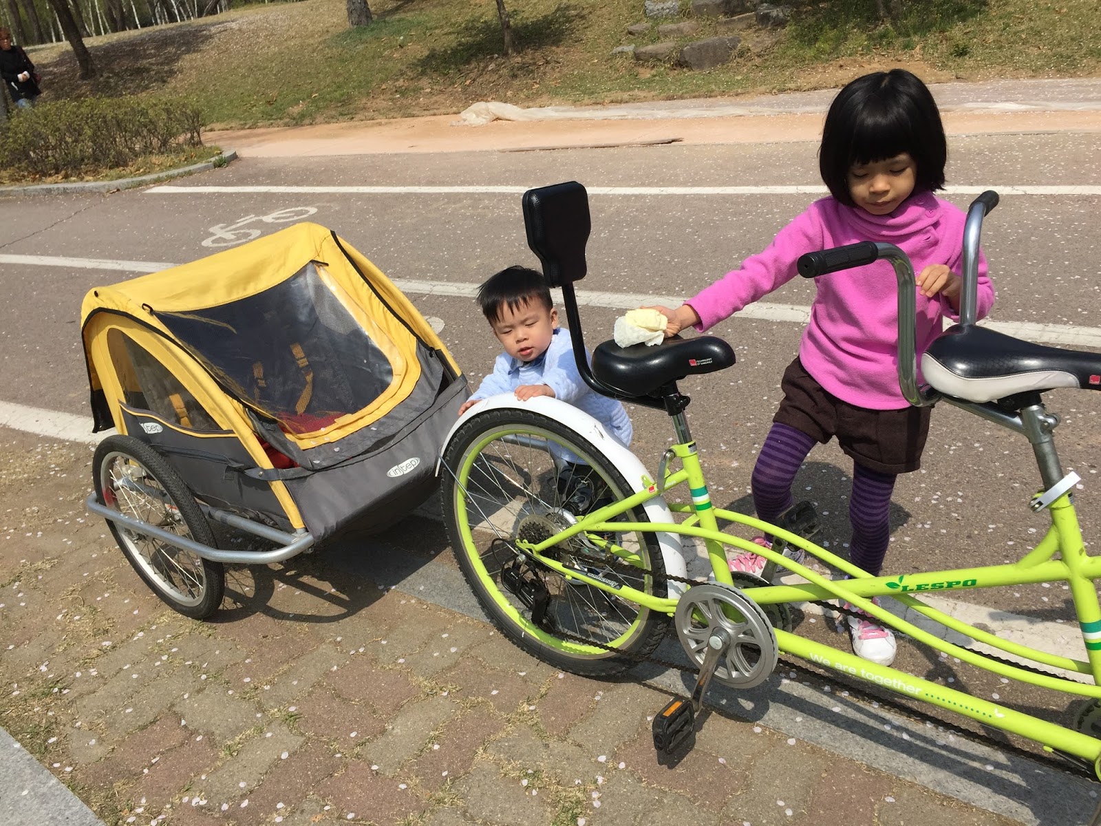 位于首尔近郊的高阳县一山湖水公园除了是亲子赏樱的好去处,也是亲子骑车的场所!我们根据达人的指路,在地铁站前往公园的路上,物色了街上其中一家出租脚踏车的商店,租了一台双人家庭协力车。车后附带一台双轮小车,车上可容纳两个儿童的座位,同时小车还附带一层透明挡风护套,在春风大力吹佛的白天,小孩躲进车子还真的暖暖的,乖乖坐着一点儿也不吵闹。